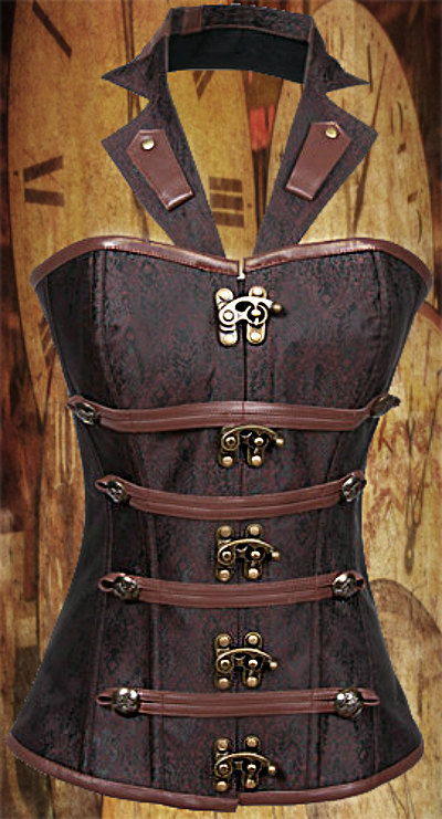 This brown steampunk corset is just what you need for your collection. Inspired by the double-breasted tailored jacket, you will love this piece.