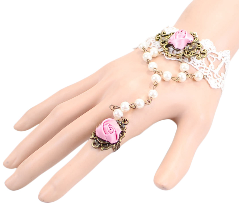 This Victorian slave bracelet features ivory lace, two pink roses, and faux pearls that come together to delicately adorn your hand with elegance.